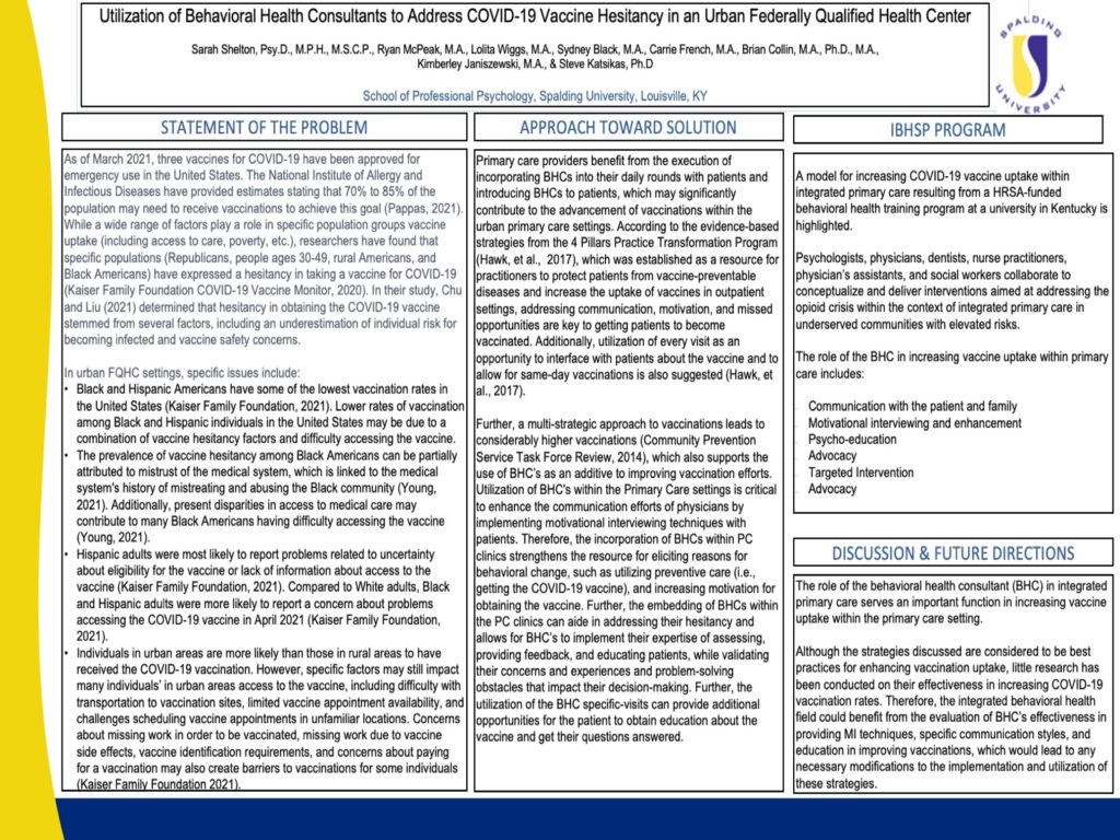 As of March 2021, three vaccines for COVID-19 have been approved for emergency use in the United States. While it is not clear exactly how many people need to be vaccinated in order to achieve the overall reduction in cases and lead to community immunity, the National Institute of Allergy and Infectious Diseases have provided estimates stating that 70% to 85% of the population may need to receive vaccinations to achieve this goal (Pappas, 2021). While a wide range of factors play a role in specific population groups vaccine uptake (including access to care, poverty, etc.), researchers have found that specific populations (Republicans, people ages 30-49, rural Americans, and Black Americans) have expressed a hesitancy in taking a vaccine for COVID-19 (Kaiser Family Foundation COVID-19 Vaccine Monitor, 2020). In their study, Chu and Liu (2021) determined that hesitancy in obtaining the COVID-19 vaccine stemmed from several factors, including an underestimation of individual risk for becoming infected and vaccine safety concerns. The authors also found that an understanding of positive community benefit and a realistic understanding of individual risks and benefits reduced hesitancy. In addressing vaccine hesitancy, Behavioral Health Consultants (BHCs) working in an integrated care model can play an essential role of facilitating the types of communication and counseling that serve to reduce vaccine hesitancy. This poster presents communication strategies best practices when providing communication and education to patients in an urban Federally Qualified Health Center serving a primary population consisting of people of color.