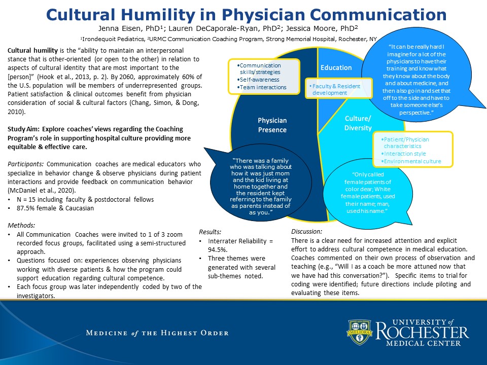 By 2060, estimates predict close to 60% of the U.S. population will be members of underrepresented groups. Patient satisfaction, medical adherence, & health outcomes all increase when physicians consider patients’ social & cultural contexts and values (Chang, Simon, & Dong, 2010). The purpose of this study was to evaluate perceptions regarding physician preparedness in providing culturally competent care. At the University of Rochester Medical Center (URMC) there are 15 medical educators who serve as communication coaches to residents in multiple disciplines as part of the Physician Communication Coaching Program. This program was developed to support an identified gap in physician education focused on patient communication skills (McDaniel et al., 2020); coaches are from interdisciplinary backgrounds and have prior expertise in behavior change and medical education. All URMC Communication Coaches were invited to participate in dialogue regarding observations of communication behaviors tied to cultural humility to better understand the need for education in this domain and how coaches could promote improved multicultural competence. All 15 coaches chose to participate in semi-structured focus groups devoted to this topic; a majority were female (87.5%) and Caucasian, and represented faculty and postdoctoral fellows. The focus groups were recorded, transcribed, and qualitatively evaluated by two of the authors. Interrater reliability was 94.5%. Several themes were generated, including Physician Presence, Education, and Culture/Diversity. Future directions include working with the coaching program to identify specific items to trial when providing communication coaching to URMC physicians.