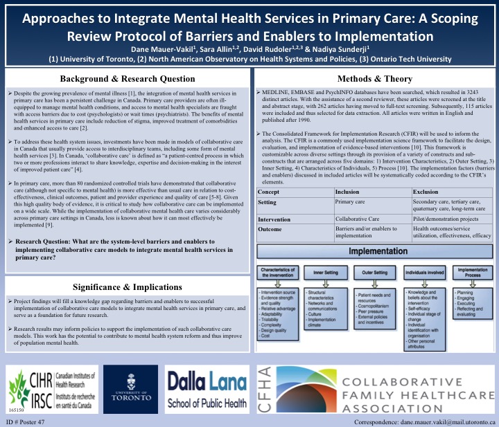 Despite the growing prevalence of mental illness, the integration of mental health services in primary care has been a persistent challenge in Canada. The design of Canadian health systems has partly contributed to siloed service delivery and barriers to accessing mental health care. This is significant as primary care is a crucial point for integration, and is often the first point of contact for individuals within the health system. Integrating mental health services into primary care leads to reduced stigma, improvement in the treatment of comorbidities, and enhanced access to care. The objective of this project is to conduct a scoping review, which will answer the following research question: what are the policy and system-level barriers and enablers to implementing evidence-based collaborative care models to integrate mental health services in primary care? Research results will have the potential to inform policies to support the implementation of evidence-based models of integrated mental and physical health care.