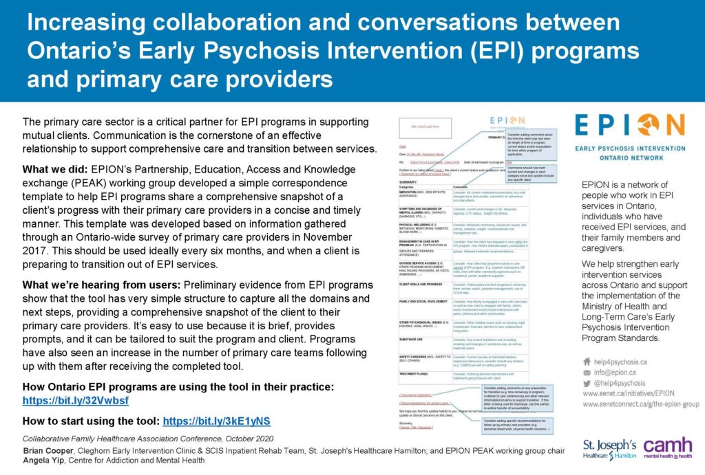 The primary care sector is a critical partner for early psychosis intervention (EPI) programs in supporting mutual clients. To support comprehensive care and transition between services, EPI programs have a responsibility to work collaboratively with primary care providers. Communication is the cornerstone of an effective relationship. To facilitate this relationship, the Early Psychosis Intervention Ontario Network (EPION) developed a simple correspondence template. This template, the EPION Primary Care Communication Tool, is designed to help EPI programs share information about a client with their primary care providers in a concise and timely manner, and facilitate comprehensive care and transitions. EPION’s Partnerships, Education, Access and Knowledge Translation (PEAK) working group developed the tool based on information gathered through an Ontario-wide survey of primary care providers in November 2017. It helps EPI staff give primary care providers a comprehensive snapshot of a client’s progress while in EPI care, ideally every six months, as clinically indicated, and when a client is preparing to transition out of EPI services. Preliminary evidence from EPI programs show that the tool has very simple structure to capture all the domains and areas, as well as next steps. It’s easy to use because it is brief and it can be tailored to suit the program and client. This tool also provides prompts allowing programs to provide a comprehensive snapshot of the client to their primary care providers. Programs have also seen an increase in the number of primary care teams following up with them after receiving the completed tool.